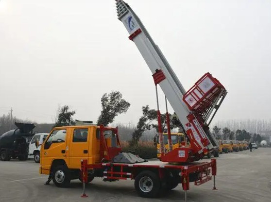 云梯车基本前提安全系数配置:作业车可以进行综合服务平台载荷400kg,很大作业高度32米,很大作业幅度11米。