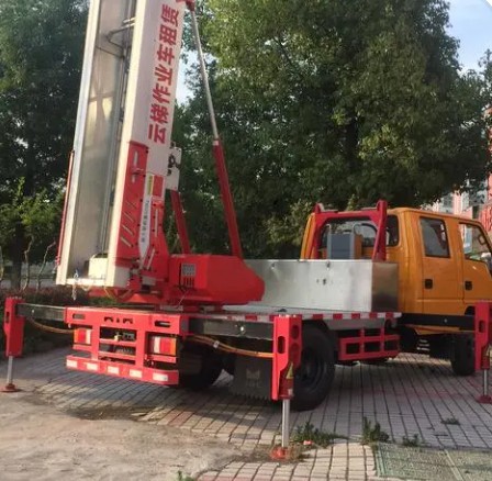 仔细调整高空作业云梯车顶端和窗台或附着物的受力点,高空作业云梯车,将空车上下运行一两遍看是否有障碍物或安全问题。